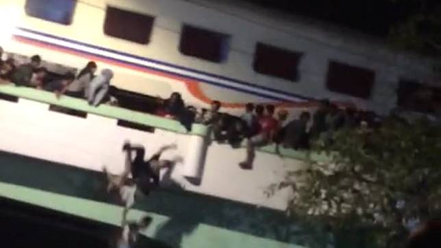Dalam kondisi padat warga yang berdesak-desakan itu mencoba menghindari KA yang melintas. Beberapa orang yang berdesakan itu ada yang terjatuh ke bawah aspal.