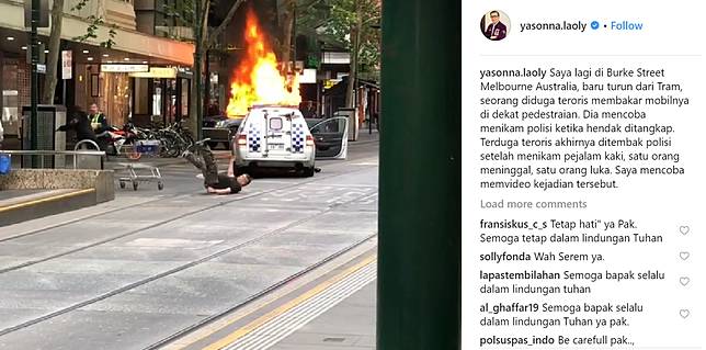 "Saya lagi di Burke Street Melbourne Australia, baru turun dari Tram, seorang diduga teroris membakar mobilnya di dekat pedestraian," ucap Yasonna.